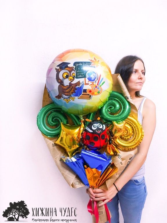 Букет из воздушных шаров на первое сентября в Краснодаре. Новые идеи - всегда оригинальны! Таких воздушных шаров вы точно еще не дарили. Подойдет для презента ученику или любимой учительнице. Стильный букет из шариков, упакованный в крафтовую бумагу, с индивидуальным декором. Полностью ручная работа! По вашему желанию можем изготовить букетик в любой цветовой гамме, для любого праздника. Детали можно обсудить по тел. 8-989-294-56-12.