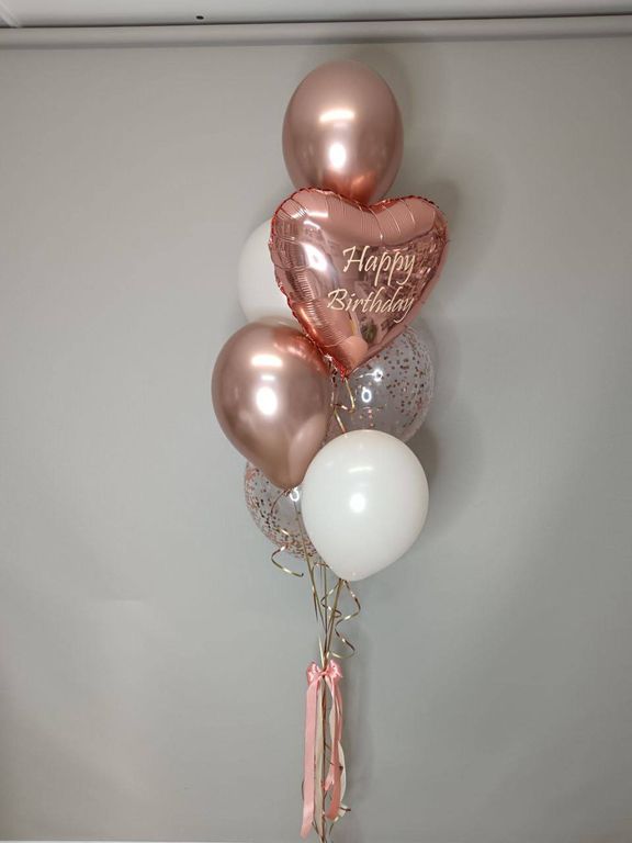 Фонтан из 7 шаров: 2 шара пастель бежевого цвета, 2 шара хромированных, 2 шара с конфетти, 1 фольгированное сердце с индивидуальной надписью.