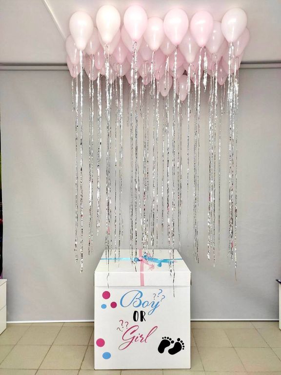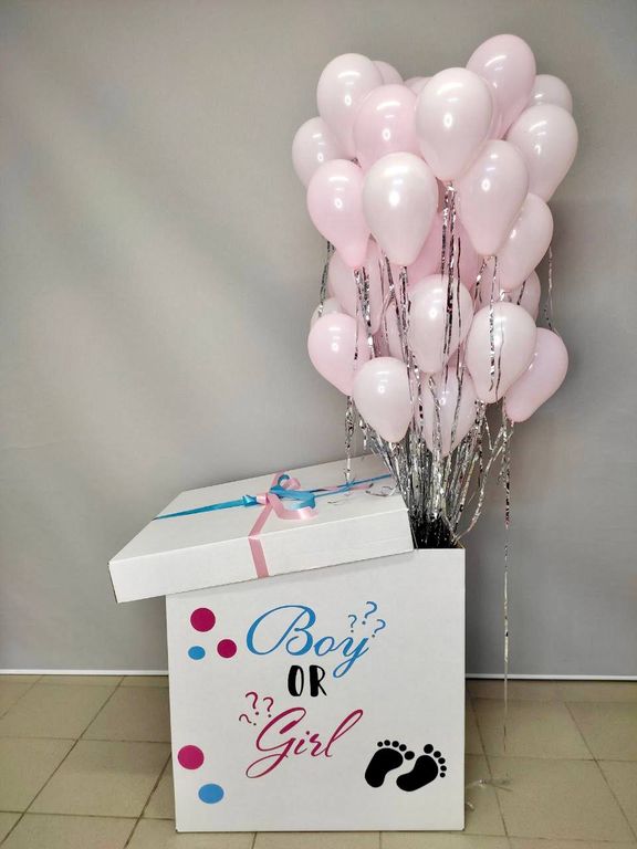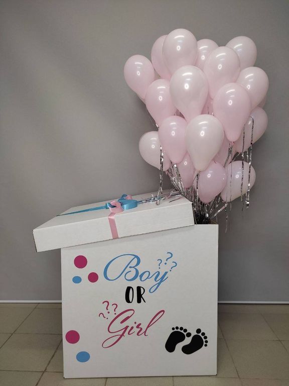Коробка-сюрприз для гендер пати в Краснодаре. Коробку можно дополнить розовыми или голубыми шариками, фольгированными шарами в виде Малыша (мальчика или девочки). Цвет коробки и надпись могут быть изменены по вашему желанию
