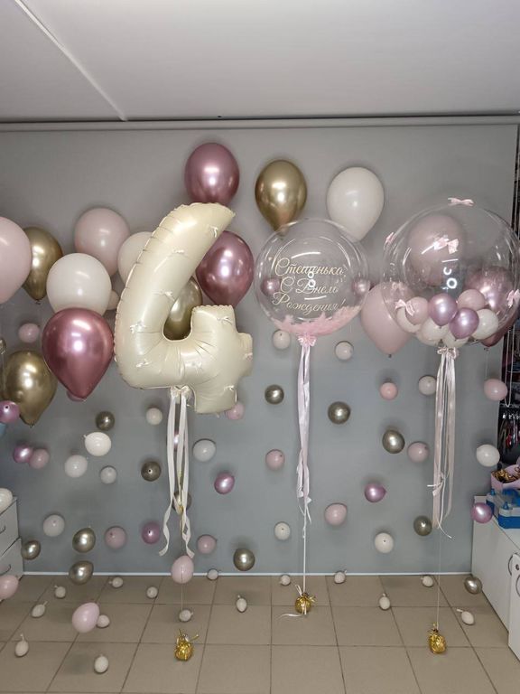Все шарики надуты гелием с обработкой для долгого полета. Надпись на шаре баблс вы можете придумать сами. Цветовая гамма может поменяться
