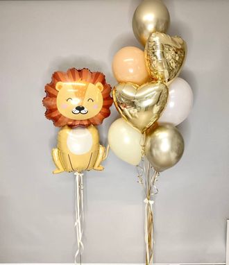 - Связка из 10 шаров: 2 фольгированных сердца , 2 шара золото хром, 6 шаров пастель