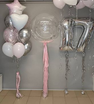 - 1 Фонтан из шаров, в котором 10шаров ( 2 прозрачных шара с наполнением, фольгированная звезда с индивидуальной надпись. фольгированное сердце, 3 шара хром, 3 шара пастельного цвета)