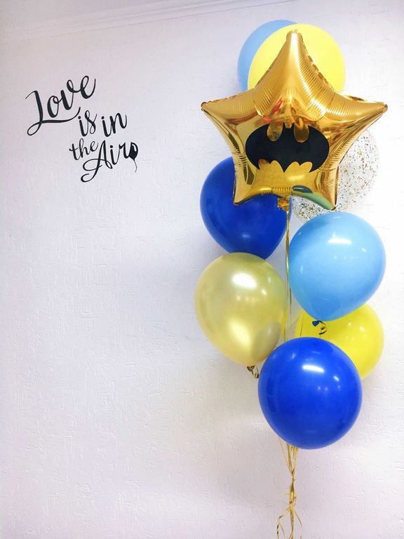 Воздушные шары в стиле Бэтмена купить в Краснодаре. Такой фонтанчик отлично подойдет для подарка любителю комиксов DC. По желанию цвет шаров может меняться.