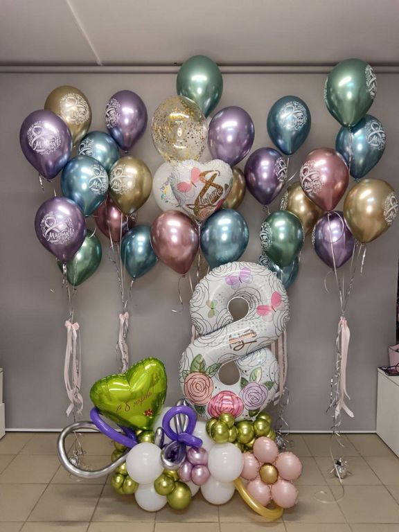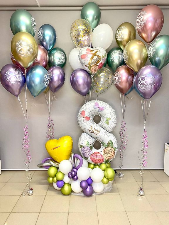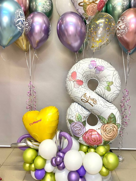 Композиция из воздушных шаров в Краснодаре. Отлично подойдет в качестве подарка на 8 марта, а также на тематический праздник или в качестве элемента оформления. Такая композиция порадует вас или ваших близких!
