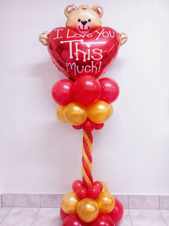 Стойка из воздушных шаров на 14 февраля с забавным медвежонком. Такая композиция - отличное решение для тематического оформления вечеринки, магазина или любого другого заведения. Подробнее в описании.