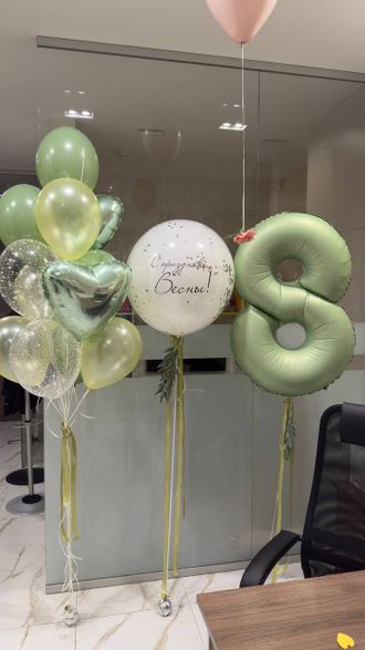 - Связка из 12 шаров, в которой 2 фольгированных сердца, 4 шара пастель, 4 шара металл, 2 шара с пенопластовыми шариками