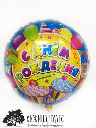 Воздушный шар круг с рисунком с днем рождения в Краснодаре. Шарик с красочным рисунком сладостей. Отлично подходит для украшения праздника, сюрприза на торжество, подарка. Хорошо смотрится в композициях с обычными латексными шарами и шарами-цифрами.