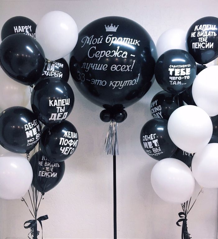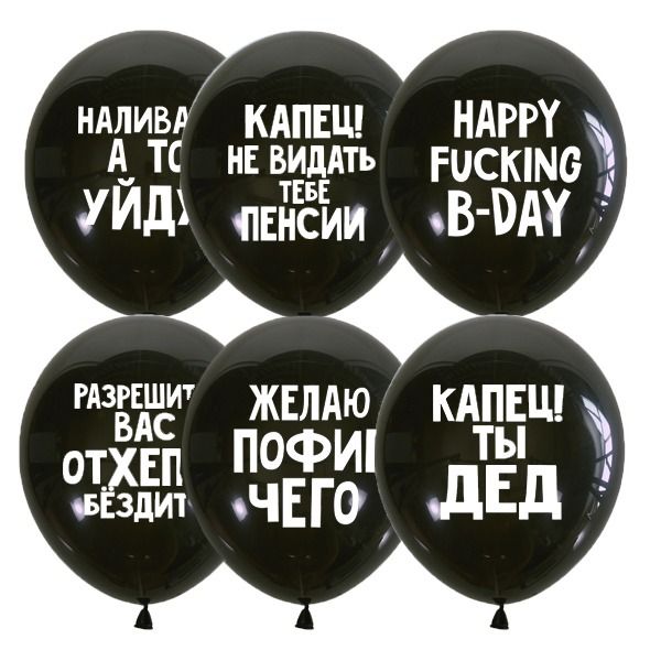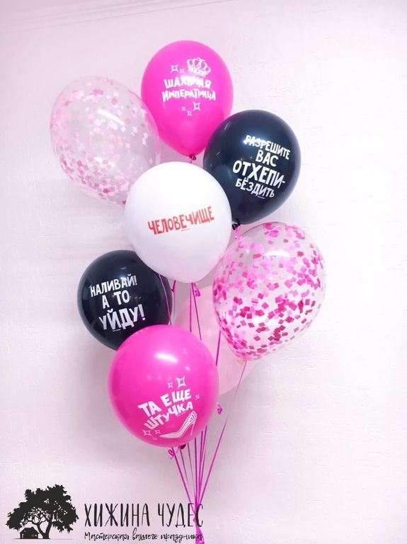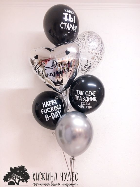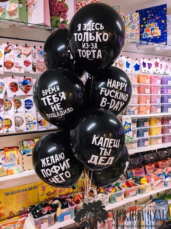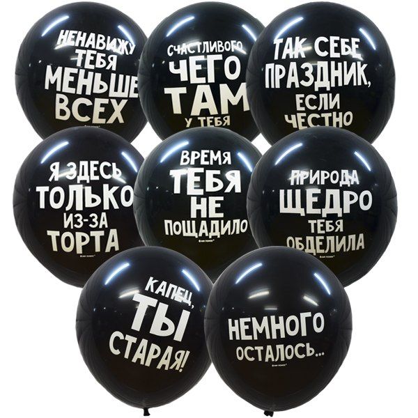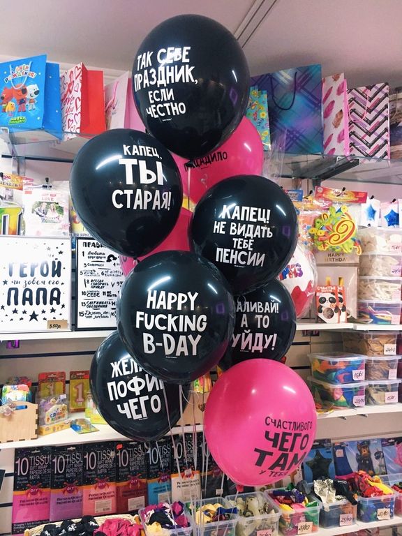 Новинка сезона - воздушные шары с надписями в стиле черного юмора. Хотите удивить друга - подарите ему фонтан из таких шаров и ваш сюрприз точно будет самым оригинальным на вечеринке!