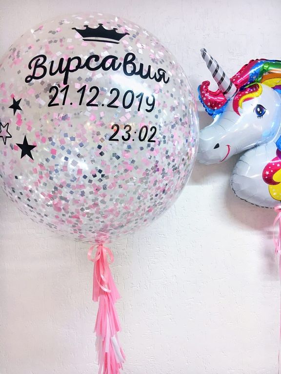 Большой прозрачный воздушный шар с конфетти, любой надписью и кисточками-декором снизу