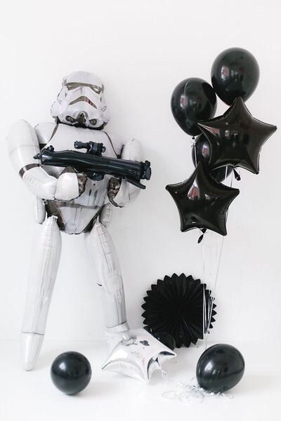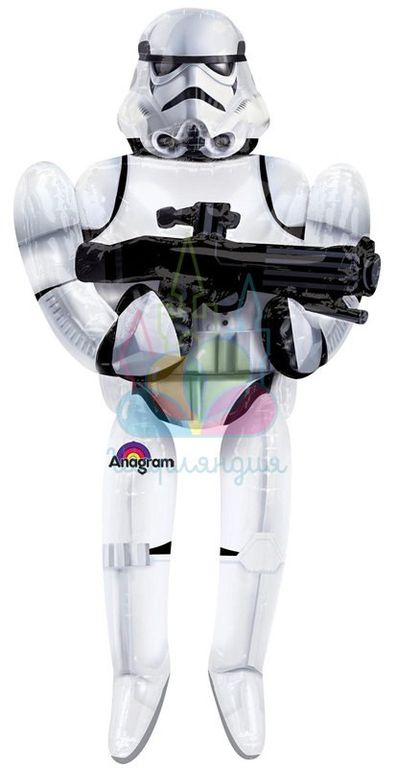 Огромный фольгированный воздушный шар с гелием в форме штурмовика, героя фильма "Звездные воины". Отлично подходит для украшения праздника, сюрприза на торжество, подарка. Хорошо смотрятся в композициях с обычными латексными шарами и шарами-цифрами.