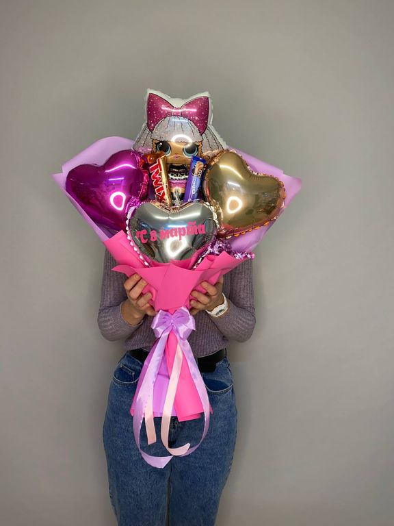 Высота букета 70 - 80 см. Все шарики надуты воздухом, сделаны из специального материала, который держится довольно долго. Композиция будет радовать вас и получателя от трех дней до нескольких недель. Все шарики подбираются индивидуально